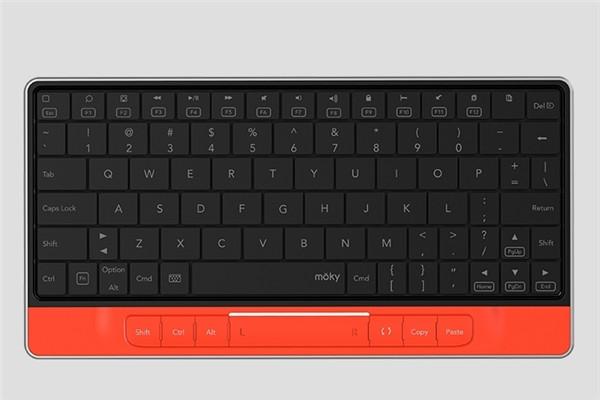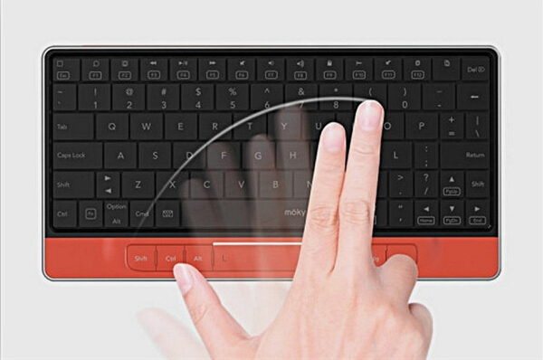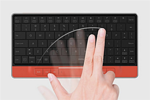 这个键盘名叫Moky,外形与普通的键盘没有什么区别,但它具有隐形触控功能而且支持手势操作,Moky将键盘与鼠标很有创意地结合为一体。键盘上有一个触控感应区域,鼠标移动、拖拽、点击等功能可在感应区内实现。简单来说,就是键盘表面拥有了笔记本电脑的触控板功能,Moky既是键盘也是鼠标。