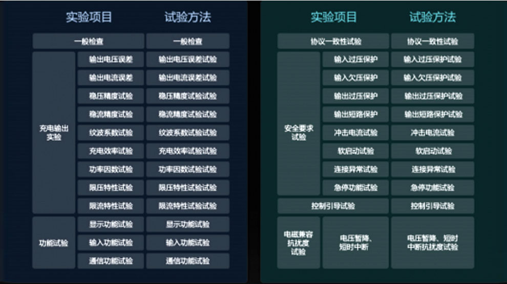 充电桩测试项目一般分为:充电输出实验、功能实验、协议一致性试验、安全要求实验、控制引导实验、电磁兼容抗扰度实验等。