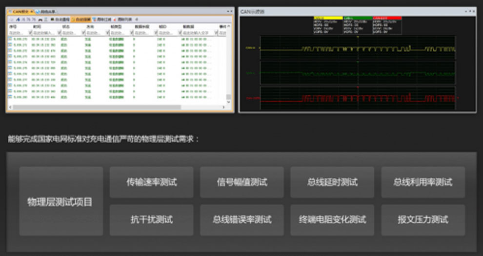 充电桩测试系统由三部分构成:电网模拟源、负载以及测试柜。而测试柜中一般包含功率分析仪、示波器、CAN总线分析仪等。