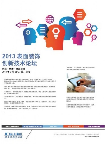 2013表面装饰创新技术论坛将于2013年3月26日至27日在上海举办,聚集设计、材料、制造等领域专业人士,探讨CMF (Color, Material, Finishing) 的发展应用及选择组合。
