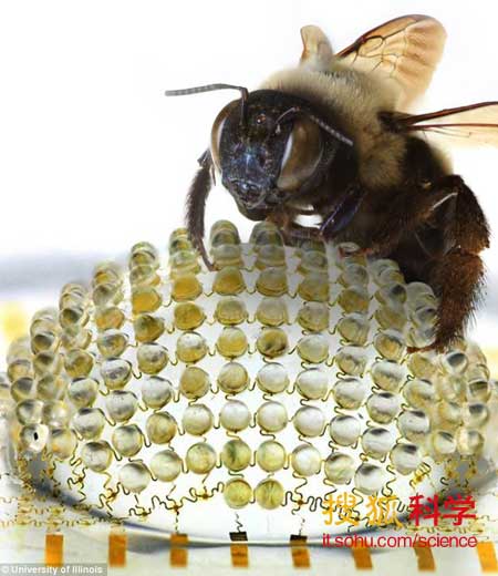 | 研究人员仿造昆虫的眼睛制造出了新型透镜:一只蜜蜂停在该透镜上 |