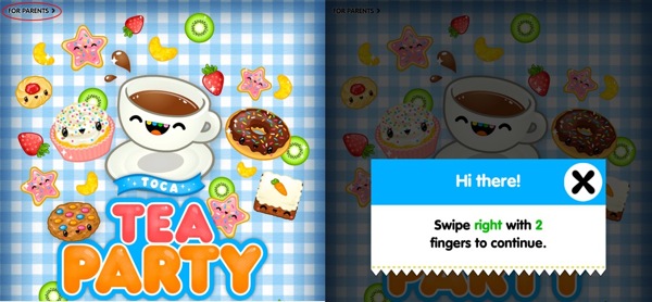 Toca Tea Party使用了一个简单的文字链接来防止意外访问。一旦按下后,用户就可以看到有一组特定的文字链接的模态窗口。对于孩子来说,这个模态窗口是游戏过程中的一个间断休息,窗口上大大醒目的“X”就很想让人去点击,点击后就返回到主界面。