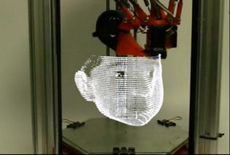 光影涂鸦就是夜间使用发光源在半空中做出动作,并将照相机快门调到很慢,拍摄出一系列光源运动轨迹的艺术效果照。那光影艺术与3d打印技术相互结合后会是什么的东西?Ekaggrat Singh Kalsi在打印头上装上一颗LED灯,在整个打印过程肉眼看不到任何东西,不过在打印完成后,通过特殊的影像处理可以看到一个刚刚打印的光影立体影像,这有点类似虚拟现实(Virtual Reality),简称VR。目前3d打印成本还是很高,该技术有望减少开发阶段产品的测试打印次数,从而降低产品开发成本。