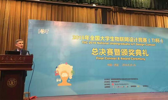 8月26日下午,2016年全国大学生物联网设计竞赛在西安交通大学落下帷幕,教育部高等学校计算机类专业教指委副主任傅育熙教授、德州仪器副总裁Peter Balyta博士、德州仪器亚太区大学计划总监王承宁博士、西安交通大学教务处副处长张俊斌等出席闭幕式并为获奖选手颁奖。闭幕式由组委会秘书长、上海交通大学王东教授主持。